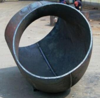 通常這樣的一些拼接彎頭都是在很大的管道上使用的,現在就是定到1米5的尺寸都能夠采用一次成型的工藝來做出來。并且就是這樣的一個拼成了5節,宛如一個大蝦一樣的彎頭產品。順便說一句啊,這個產品也叫做蝦米腰彎頭。在他和無縫彎頭之間,還有一個兩半的彎頭產品的拼接工藝。就是說什么呀?采用鋼板,然后下好了材料之后,在壓力機上壓出來彎頭產品的一半的形狀。再把另一半給做出來,合在一起,上面一道焊縫,下面一道焊縫。也有的就是左右兩邊各有一條焊縫的,這個盡管說位置不一樣,不過所起的作用和功能是一樣的。此類產品的兩個重點,其一,就是產品材質厚度保證,其二就是產品的角度和焊接工藝的保證,有這上面的兩項技術指標合適,就可以生產出來合格的拼接彎頭的產品了。